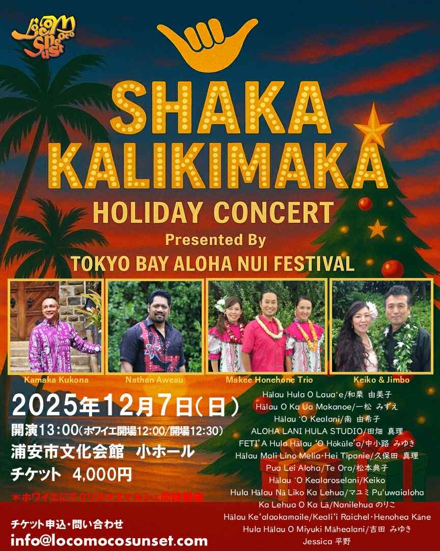 12/7(日) SHAKA KALIKIMAKA HOLIDAY CONCERT@浦安文化会館小ホール2025年12月7日 Keikoハワイアンライブ 12/7(日) SHAKA KALIKIMAKA HOLIDAY CONCERT @浦安文化会館小ホール チケットはSOLD OUTになりました Post navigationPrevious 11/17(月) 20:00〜YouTubeライブ配信!!!Next 12/14(日) メレフラChristmas Party@鎌倉プリンスホテルバンケットルーム