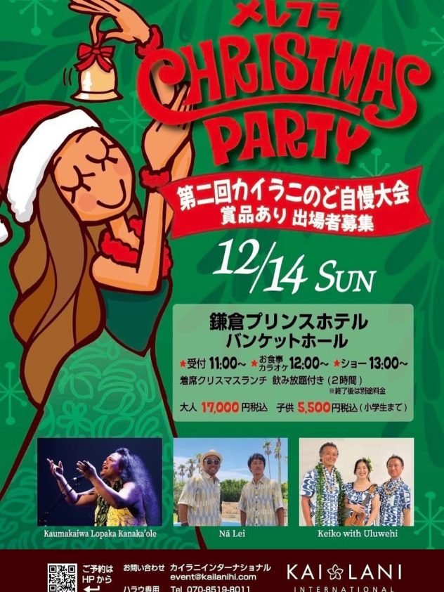12/14(日) メレフラChristmas Party@鎌倉プリンスホテルバンケットルーム2025年12月14日 Keikoハワイアンライブ 12/14(日) メレフラChristmas Party @鎌倉プリンスホテルバンケットルーム カラオケ大会もあります❣️エントリーお待ちしています。 ホールコンサートとは違う大宴会のような楽しいパーティーです。 ぜひ、オシャレしていらしてくださいね。お着替えスペースもあります✨ Post navigationPrevious 12/7(日) SHAKA KALIKIMAKA HOLIDAY CONCERT@浦安文化会館小ホールNext 12/16(火) Three Titas @横浜THUMBS UP